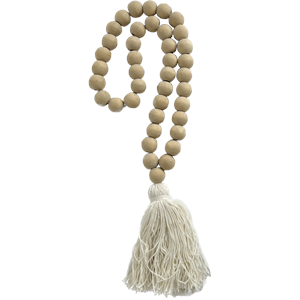 A decorative piece with round beads and a cotton tassel designed to hang on a hook, handle or use as a tie back for curtains. Available in white, black and moss.Measurements 55x2.5cm
